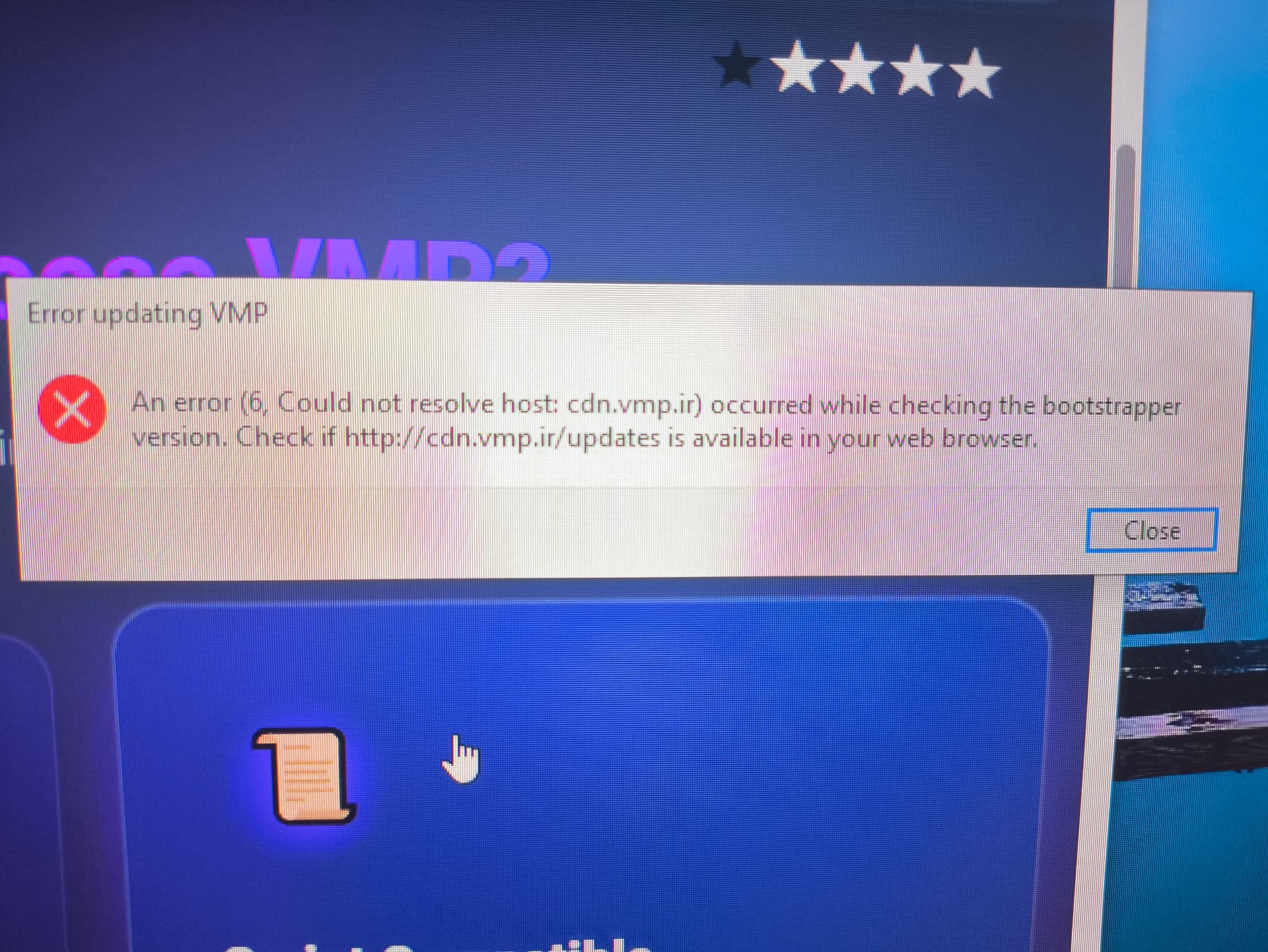 An error (6, Could not resolve host: cdn.vmp.ir) occurred while checking the bootstrapper version. Check if http://cdn.vmp.ir/updates is available in your web browser.مشکل شما چیست؟